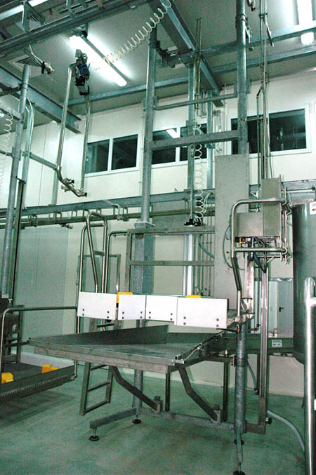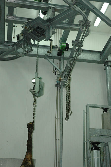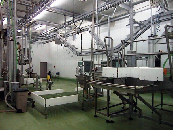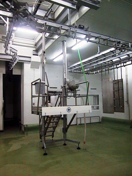 The lines include stunning boxes with ritual or traditional function, efficient automatic transfer systems, mobile platforms, automatic slaughtering lines (conveyors) or gravity slaughtering lines, inspection lines for organs, dehiding machines, saws, conveyors for pre-cooling and rails for cold stores.