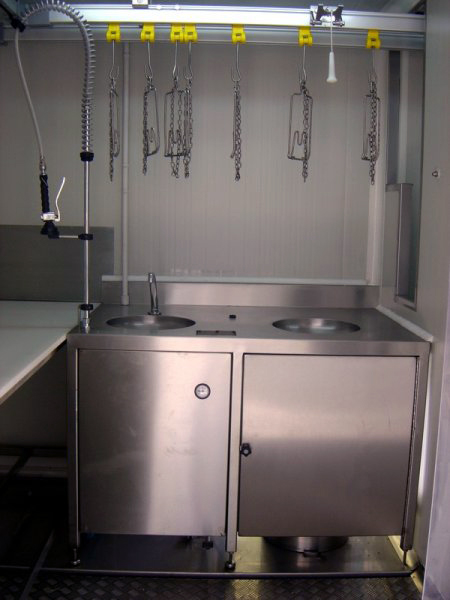The conatiner is delivered with aluminium doors, windows whit anti-mosquito nets entrance doors, windows with mosquito nets and hatchback for the removal of by-products of slaughter.