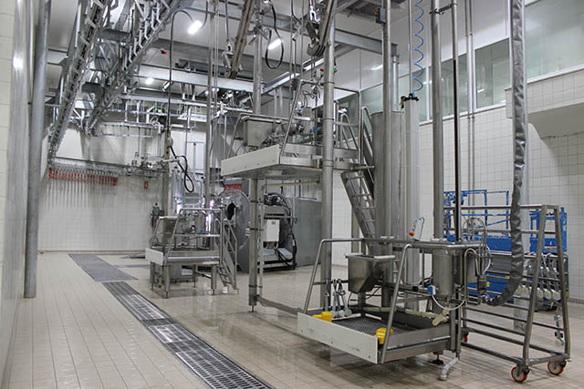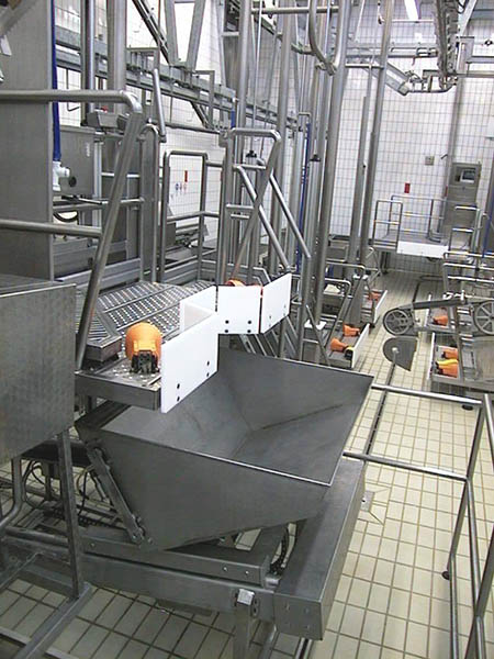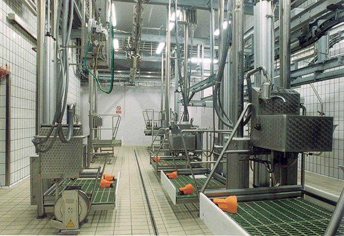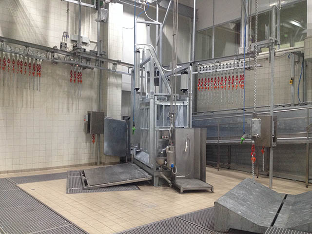 The lines include stunning boxes with ritual or traditional function, efficient automatic transfer systems, mobile platforms, automatic slaughtering lines (conveyors) or gravity slaughtering lines, inspection lines for organs, dehiding machines, saws, conveyors for pre-cooling and rails for cold stores.